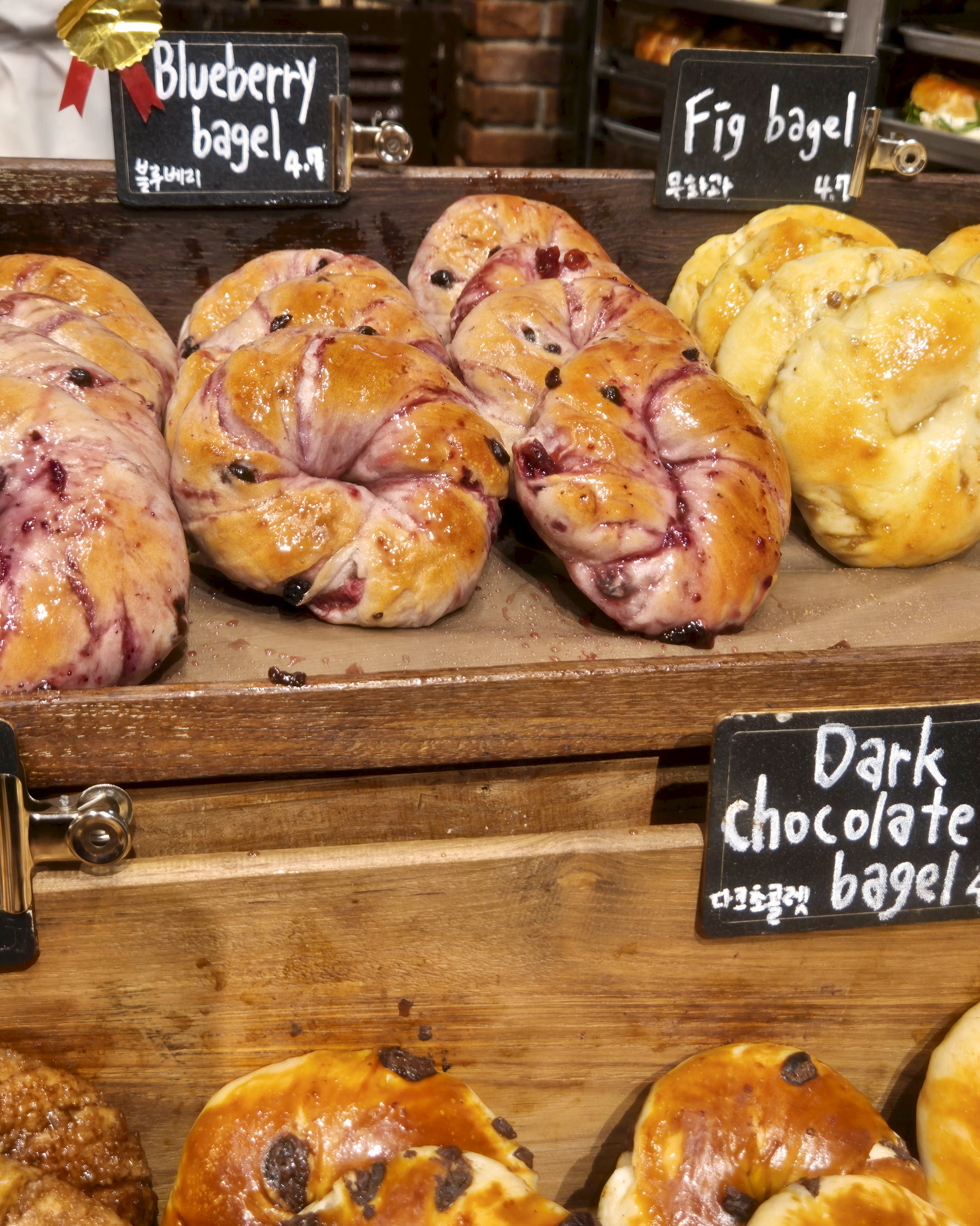 베이글 종류를 미리 좀 봐두긴 했는데 결국 막상 가서는 느낌대로 골라버렸는 것... 일단 들어가면 차례대로 줄을 서서 베이글이 놓인 진열대를 천천히 이동한다. 나는 먼저 블루베리 베이글을 집어들었다. 맛있다는 후기도 보았고 평상시에 베이글 집에서 블루베리 베이글이 항상 아쉬웠기 때문에 과연 여기는 맛이 어떨지 궁금했다.